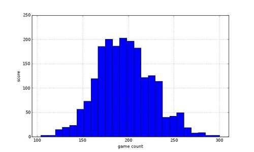 ボウリングをやりはじめた2年ぐらいのスコアを分析していると割とキレイな正規分布になっていた。 自然界のあらゆる現象は正規分布にのってくるわけで、ボウリングのスコアも大勢の人のスコアを統計的に処理したら、きっと、正規分布になると思う。 ただ、…
