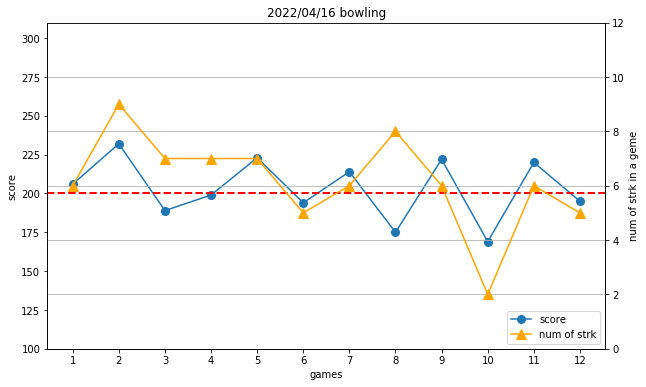 その後の3,4ゲームもストライク数は7個あるが、1ゲーム内にイージーミスを2フレもやってしまって、200を切っている。