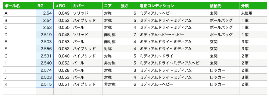 この一覧を作る前にも各ボールのスペックを記録しているテキストファイルはあったのだけど、分類と格納場所を管理したくなってきて、表形式にしたという経緯になる。