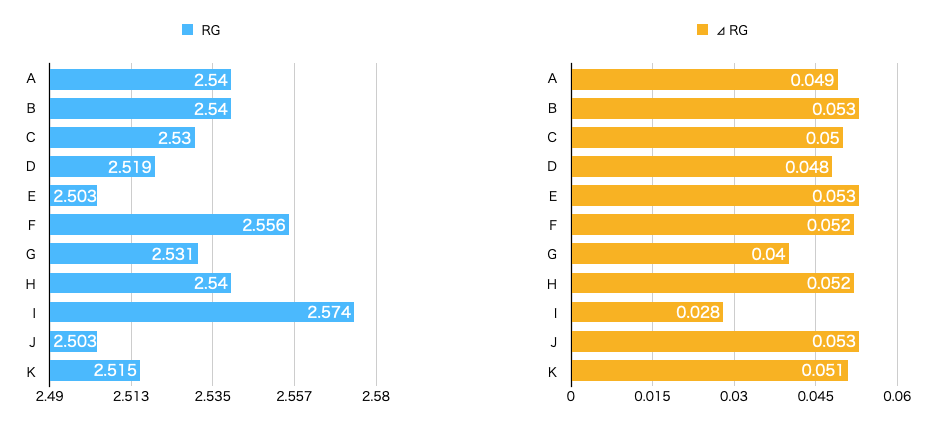 RG値、⊿ RGをグラフにしてみると以下になる。自分的には、高慣性のボールが向いていると思っていたのだけど、微妙な数値の違いも視覚化すると、はっきりする。