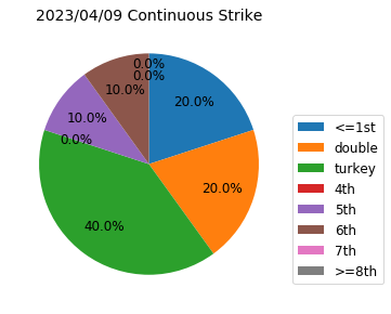 本日の結果としては、ダブルをターキーはできているが、それ以上にできているゲーム数が少ないので、そこが課題に見える。内訳をみると、1ゲーム目とアメリカンの9ゲーム目がターキーだったので、それを除くと2ゲームになる。4th以上が、2ゲームなので、4ゲーム中の半分は、4th以上になっているので、まあ、十分な結果かなと思う。
